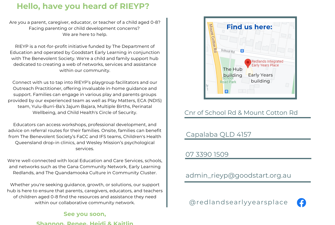 Redlands Integrated Early Years Place (RIEYP) is a not-for-profit initiative funded by The Department of Education and operated by Goodstart Early Learning in partnership with The Benevolent Society.