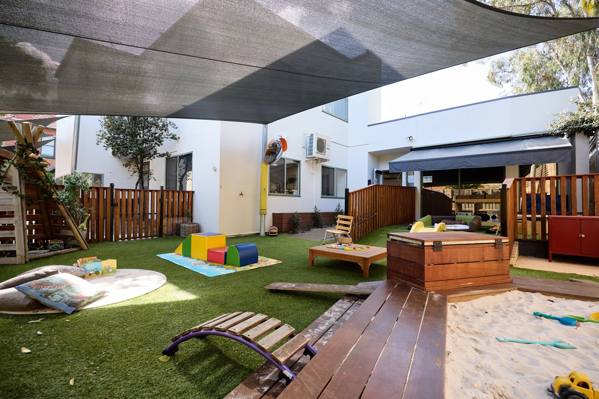 Outside, our playground areas are a balance of natural and manmade elements and play surfaces – with sandpits, worm farm, vege patch, water tank, mud kitchen, bike path, gardens, a stage, cubbyhouse and lots of shade. We have carefully designed and planned spaces to encourage a stronger understanding of the environment and sustainability – while giving children the scope to explore, play and let their imaginations roam.