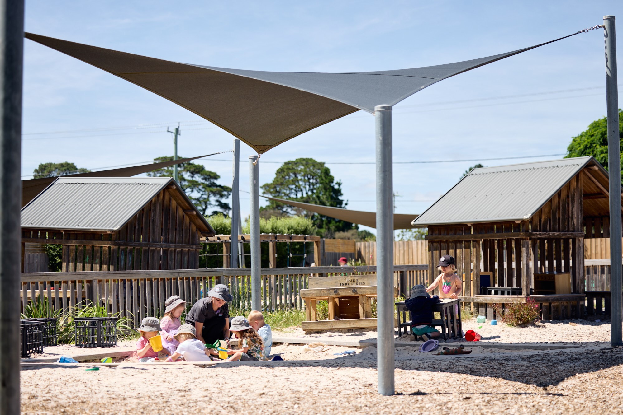Outside, we have age appropriate play spaces and equipment, all geared to enhance the children’s awareness of their surrounds and the greater environment, as well as their understanding of the importance of sustainability. Our three play areas have sandpits, vege gardens and worm farms, mud kitchen, play domes, teepees, bike paths, a climbing cube and lots of natural and manmade play surfaces and shade.