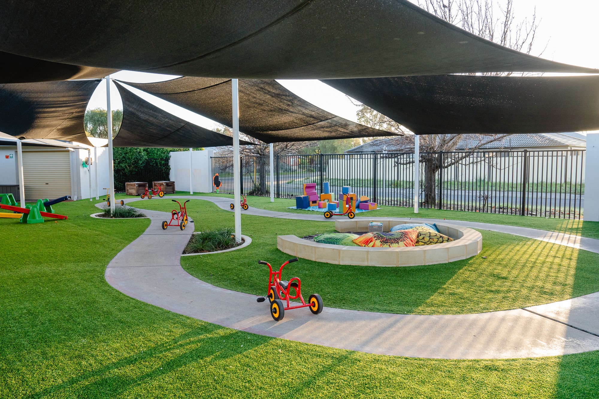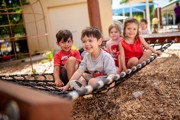 Outside, we have three areas all with age appropriate play spaces and equipment. We have plenty of space for the children to explore and use their imaginations with a balance of manmade and natural elements including sandpits, veggie patches, a worm farm, nursery yard, wooden fort, tractor tyres, bark pit, climbing equipment, a bike track and of course lots of shade!